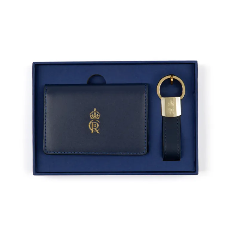 Leather Card Wallet And Keyring Set, Featuring King Charles Iii’S Cypher Embossed In Gold On Leather. Gold Plated Kerying And Diamond Engraved.