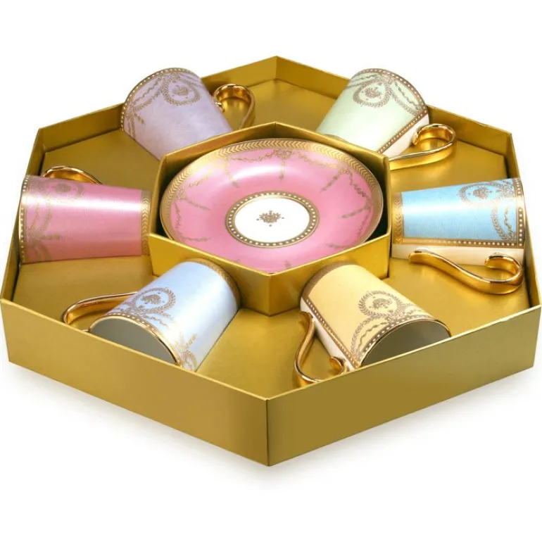 The Set Consists Of Six Different Colourways; Pale Blue, Pink, Turquoise Blue, Yellow, Green And Lilac, And All The Coffee Cups And Saucers Are Delicately Finished With A 22 Carat Gold Intricate Design. All The Pieces Are Made Entirely By Hand In Stoke-On-Trent, England Using Traditional Methods.