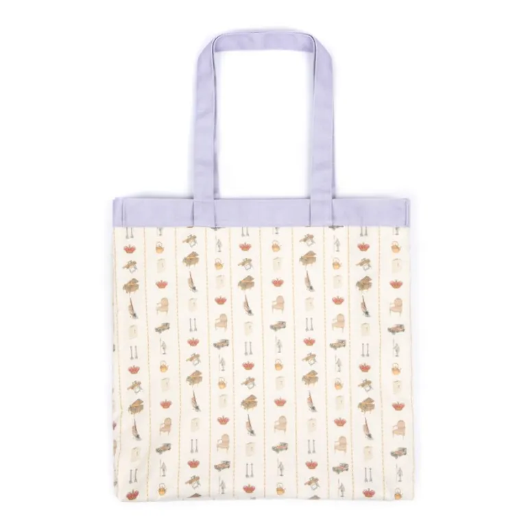 A Spacious, Organic Cotton Tote Bag With Three Designs. Illustrated With The Exterior Of Queen Mary’S Dolls’ House On One Side And A Striking, Purple Graphic On The Opposite. The Lining, Which Can Also Be Turned Inside Out, Reveals A Pattern Of Illustrated Miniatures Taken From Real Items In The Doll’S House.