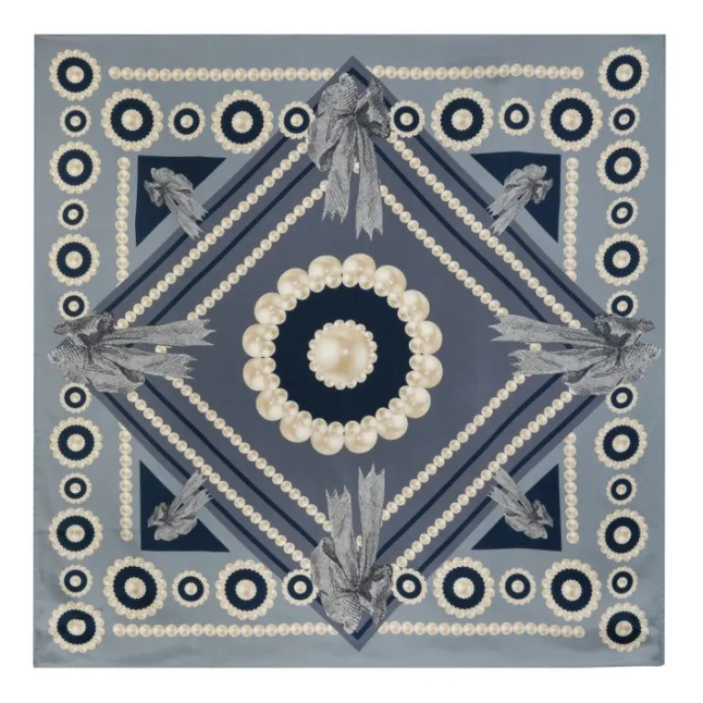 This Silk Scarf Draws Inspiration From A Necklace From Within The Exhibition. The Necklace Is Made Of Blue Enamel Discs, With Pearl Centers And Graduated Rows Of Pearls As Borders.